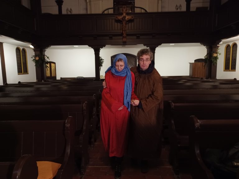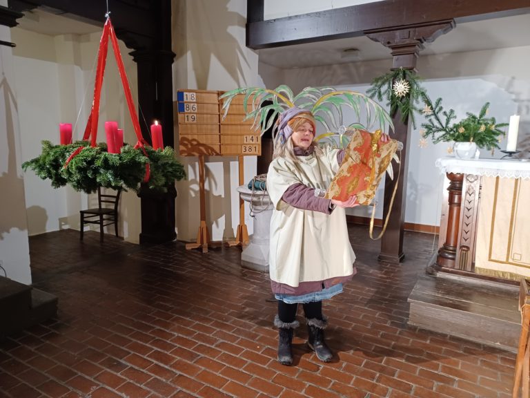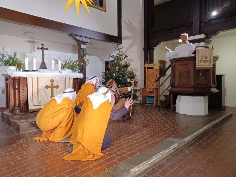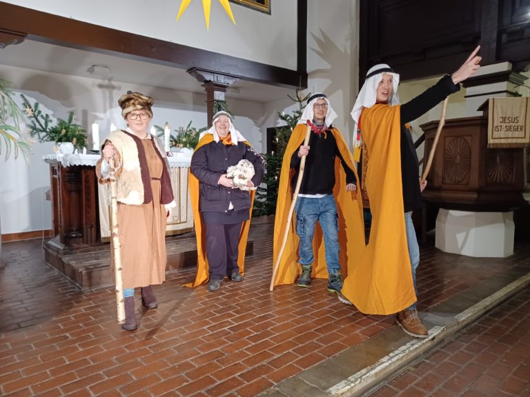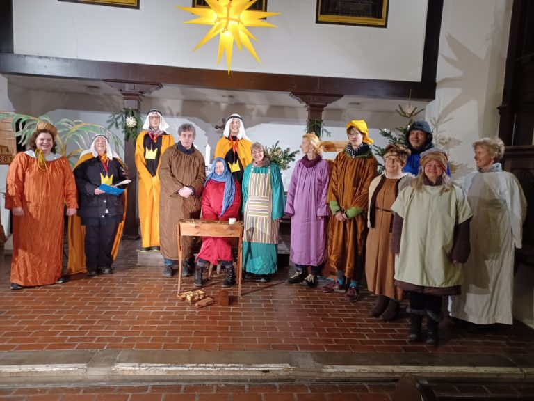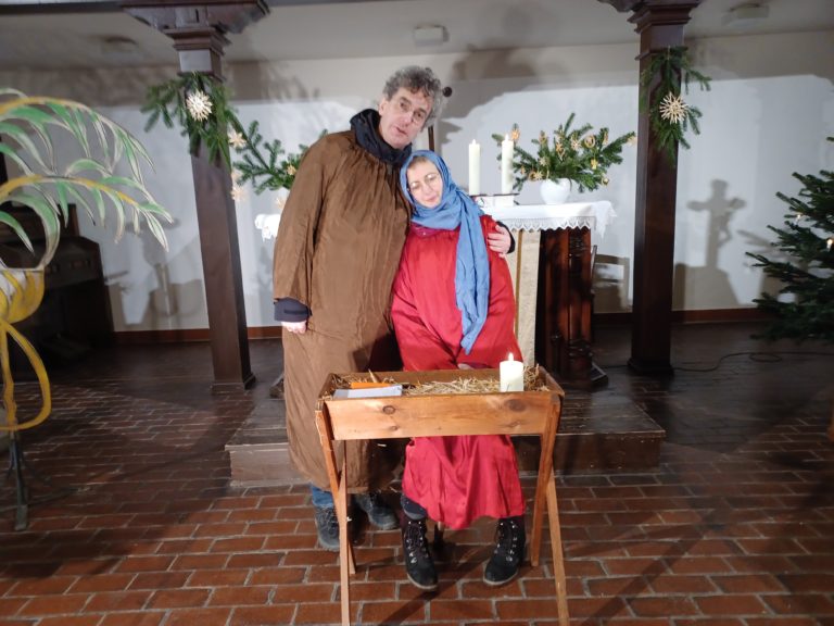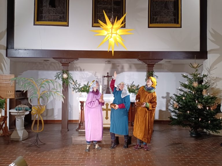 Erwachsenenquiz Station 1 Dass alle in ihre Heimat reisen mussten, hatte mit Steuereintreibung zu tun. Zu der Zeit wurde eine Steuerschätzung mit der […] weiterlesen Station 2 „Mit seinem vertrauten Weibe“ – was bedeutete das tatsächlich? A – Sie hatten eine vollgültige Eheschließung vollzogen. B – Sie […] weiterlesen Station 3 Die Geburt Christi ist das Motiv in allen diesen Kunstwerken. Können Sie zuordnen, wo diese zu finden sind? A Barcelona, […] weiterlesen Herbei, o ihr Gläub’gen Während Sie zur nächsten Station laufen, können Sie das Lied ” Herbei, o ihr Gläub’gen” singen. Herbei, o ihr Gläub’gen, […] weiterlesen Station 4 „Euch ist heute der Heiland geboren“! Warum wird Jesus Christus als Heiland bezeichnet? A – weil er Todkranke heilte B […] weiterlesen Kommet, ihr Hirten, ihr Männer und Fraun Während Sie zur nächsten Station laufen, können Sie das Lied “Kommet, ihr Hirten, ihr Männer und Fraun” singen. Text: Carl […] weiterlesen Station 5 Engel werden schon im Alten Testament beschrieben. In den Chroniken steht zum Beispiel über den Tempelbau des Königs Salomo: Er […] weiterlesen Vom Himmel hoch, da komm ich her Während Sie zur nächsten Station laufen, können Sie das Lied ” Vom Himmel hoch, da komm ich her” singen. Text: […] weiterlesen Station 6 Drei Geschenke sind es. Von den Heiligen Drei Königen. Das ist kein Zufall. „Aller guten Dinge sind drei“, heißt es […] weiterlesen Stille Nacht, heilige Nacht Während Sie zur nächsten Station laufen, können Sie das Lied ” Stille Nacht, heilige Nacht” singen. Text: Joseph Mohr 1816, […] weiterlesen Station 7 Sie priesen und lobten Gott für alles“, heißt es – das lassen Sie uns auch tun! „Jauchzet, frohlocket“, so heißt […] weiterlesen O du fröhliche, o du selige Während Sie nun nach Hause gehen, können Sie das Lied ” O du fröhliche, o du selige” singen. Text: Str. […] weiterlesen Der Lützschenaer Krippenweg ist eine gemeinsame Aktion von: