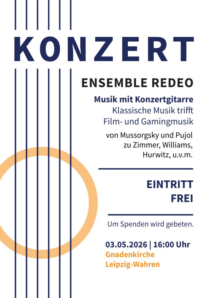 Wir laden ein zum Konzert mit dem Ensemble Redeo am 03. Mai um 16:00 Uhr in der Gnadenkirche Wahren.