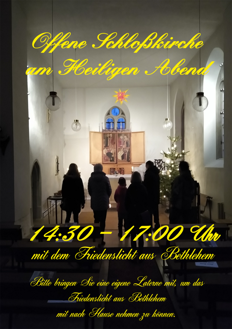 Die festlich geschmückte Schloßkirche wird von 14:30 Uhr bis 17:00 Uhr geöffnet sein, um bei einem stillen Gebet an der Krippe kurz zu verweilen und das Friedenslicht aus Bethlehem abzuholen. Dafür sollte man eine kleine Laterne mitbringen. Ein herzlicher Dank gilt Familie Lorenz, die dieses Angebot ermöglicht und mit dem Spielen von Advents und Weihnachtsliedern an der Orgel für die richtige Weihnachtsstimmung sorgt.